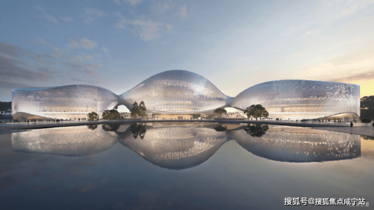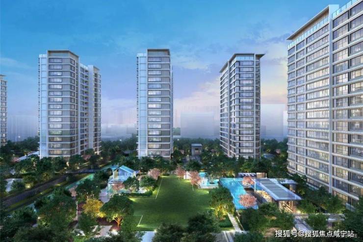 社区规划格局采用中轴对称,内部有室外游泳池、景观廊道和中心大花园,部分楼栋设置架空层,建筑里面以非对称形式的设计手法,打造现代化理念。