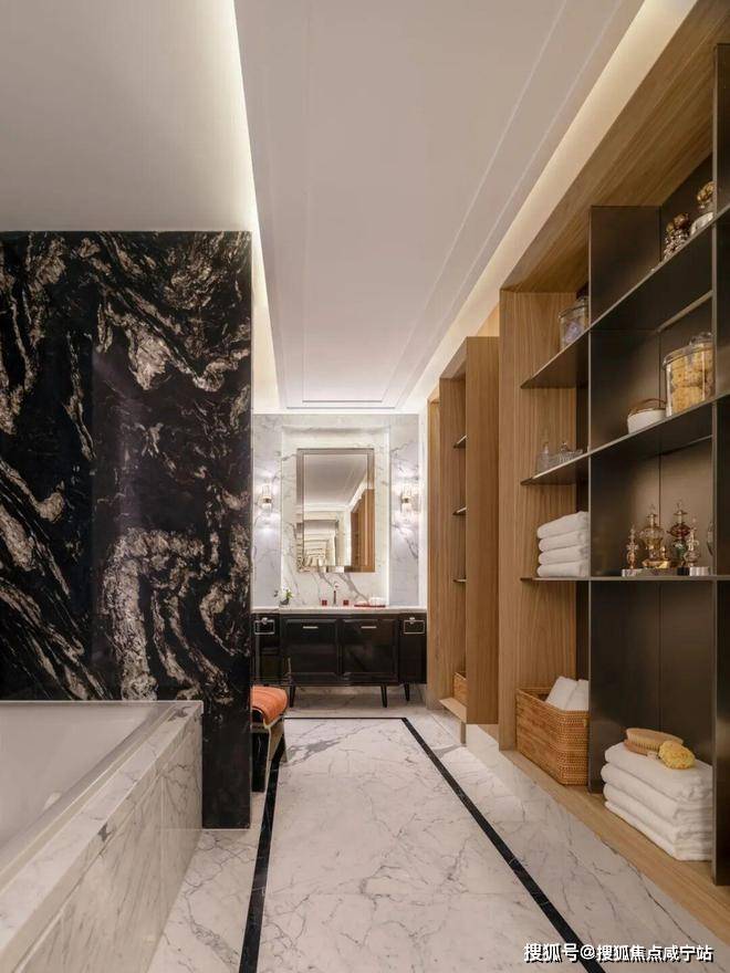 秩序,是主卫浴空间布局的重点。两个独立台盆相对而立,分属男女主人,营造出从容自如的使用体验。大面积运用黑白撞色大理石,让空间的秩序美与材质的自然美融合,颇具观赏韵味。