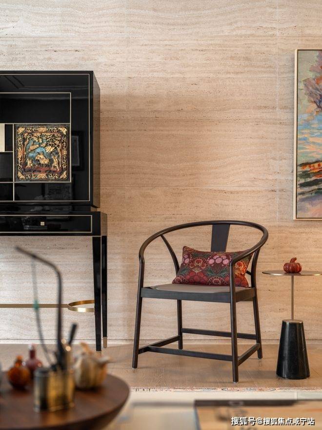 融合焕新的高柜摆放于洞石墙前,哑光与纹路丰富的米白洞石衬托出了高光黑色烤漆的深邃与沉静。而嵌入柜面的中式楠木挂屏无疑是点睛之笔,采用朱红鎏金工艺对人物和图案进行着色,展现了传统与现代完美融合的可能性。
