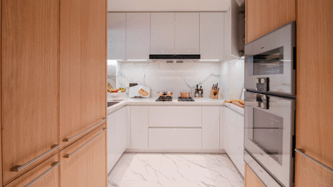 厨房采用洄游式立体布局,一半是“工作厨房”,隐于内部的中式厨房,有效避免油烟外泄,无论烹炸煎烤,空间之外清新依旧。