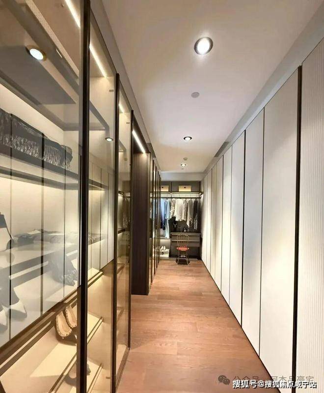 步入式衣帽间隐于卫浴内部,创造出一体化体验,金属质感的柜体材质,与卫浴石材形成对比,增加了视觉的丰富性。