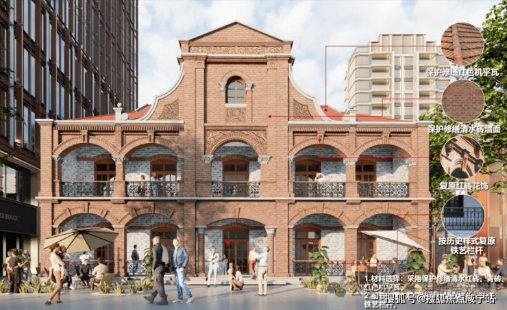 其三,兼具历史与国际的门面。功能之上,中信泰富自然也不会放弃社区风格上的打造。南侧主入口一侧为文物保护点,通过精心修缮,从清水砖墙面到红砖花饰,每一处细节都按照历史照片对比复原,延续海派气质,彰显当代活力。