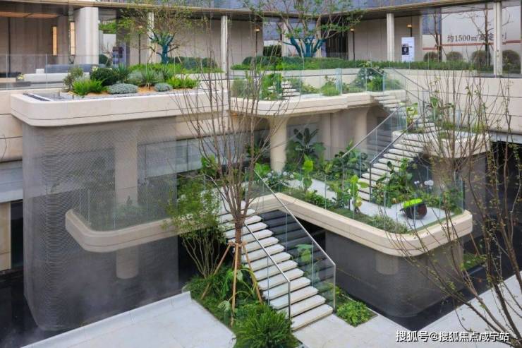 点睛之笔在于 4层悬浮式阶梯, 设计理念据说来自全球十二大奢华酒店之一的迪拜丽晶公寓, 每一个观景露台都种植着不同的植被,一步一景,更重要的是,不同的露台对应着不同的观景视野点,将不同高度的下沉式庭院景观,通过极其优雅的方式传递给了业主。 这个归家体验可以说是拉满了!
