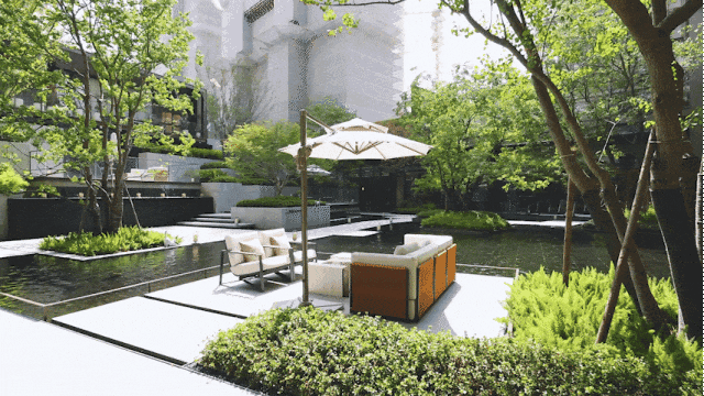 项目主入口做了环岛式酒店大堂设计,风雨回廊在天气炎热或者下雨天时让人更舒适,融合了酒店的精致感、艺术感,给人仪式感的入户体验。