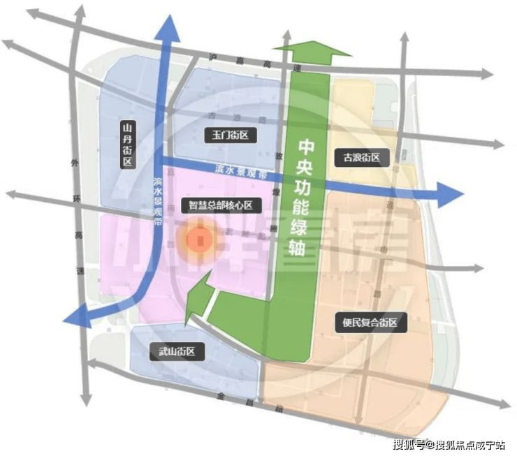 以智慧总部核心驱动,“中央功能绿轴”串联,多个功能组团为载体,推动规划区发展,形成“一轴、一心、两带、多街区”的功能结构。