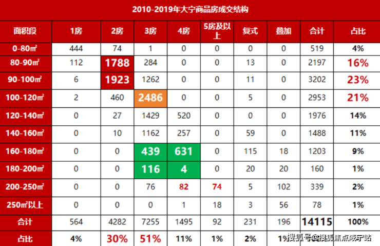 如果将2010-2019年大宁一手商品房成交单独剖析,80-120㎡的两房和100-120㎡的三房是市场的绝对主流,超过160㎡的产品,仅占成交的约13%。