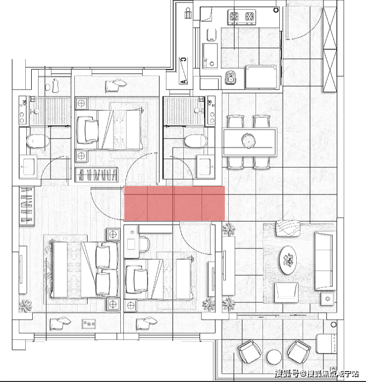 不要小看这一点,在一个中小户型里,三开间朝南,减少冗余过道,非常重要,这意味着更大的有效使用面积,下图是市面上比较常见的百平三房格局,而图中标红部分的过道空间,往往要占掉接近3㎡,这也导致了3个卧室使用面积的缩小,尤其是北卧室,经常只有5㎡左右,无法作为正常卧室使用,这也就是“伪3房”: