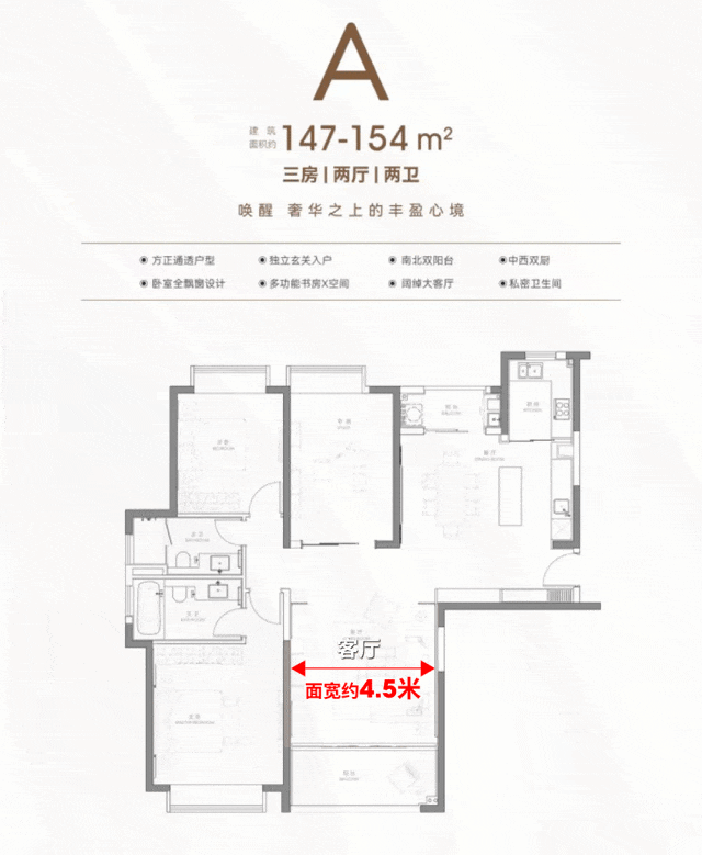 项目在售建面约134-154㎡大三房稀缺性突出,未来竞争少、需求大,易走出独立行情。