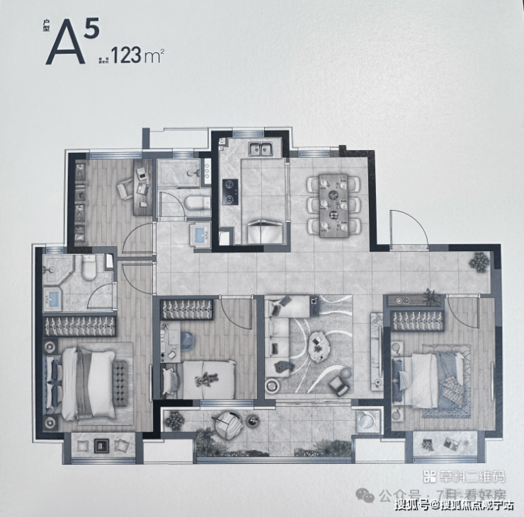 建面约123㎡的4房2厅2卫户型,超大面宽南向阳台、整体南北通透、主卧套房的设计,提升居住空间。