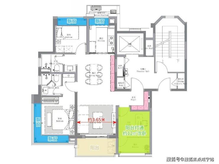 南次卧阳合打通交付,实际可使用面积约12㎡左右;