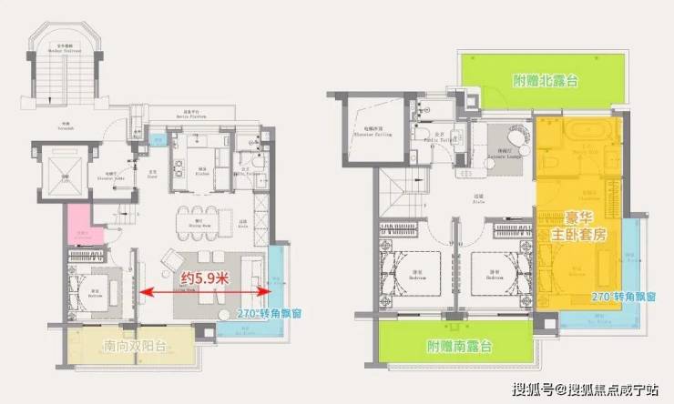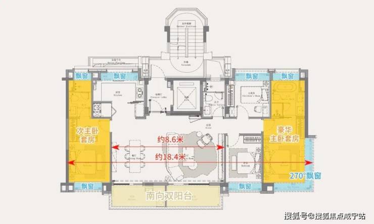 约5.9米面宽横厅,边套户型附赠270°转角飘窗,客餐厅整体形成约近35m阔绰公区,南向双阳合+预留独立储物间;