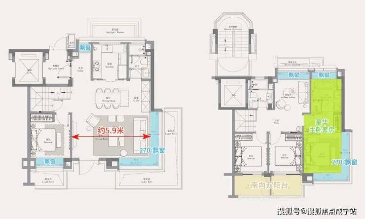 边套户型主卧为270°转角飘窗,采光更佳,外部景观视野更丰富;