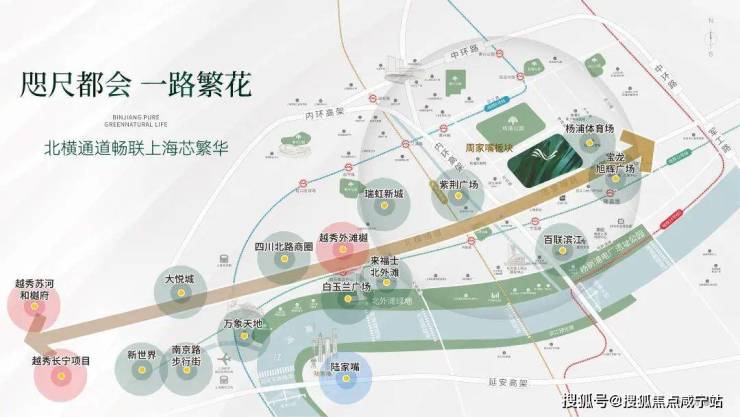 【北横通道】:继延安路高架后,上海第二条东西向财富积聚中轴线,平行于江河流向,串联虹桥-长风-苏河湾-北外滩-杨浦滨江等上海都心位置;
