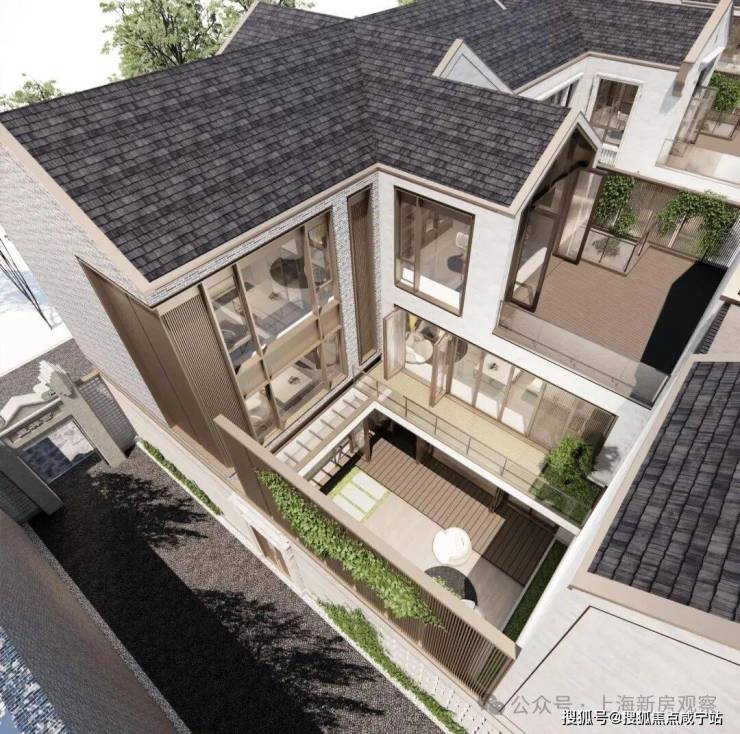 从庭园看向别墅,保留的老山墙、砖楣和门头,再加上悬挑阳台和层层露台,这种传统风貌带给人一种重见历史的感慨,又有温馨、宁静的现代舒适感。