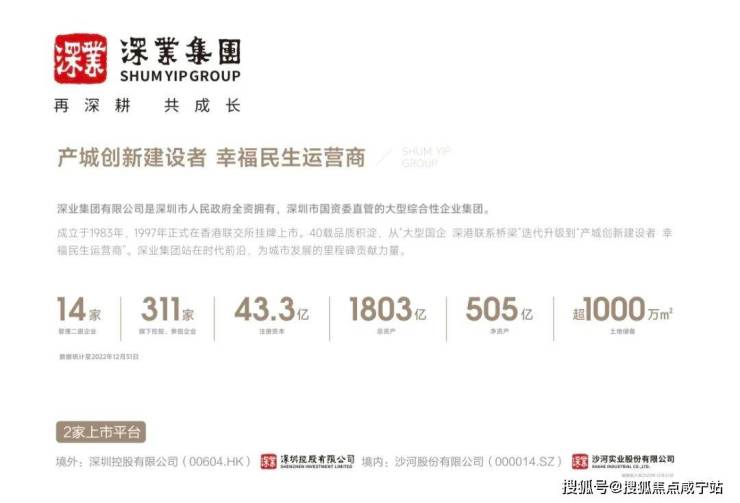 深业集团是深圳市人民政府全资拥有,深圳市国资委直管的大型综合性企业集团,成立于1983年,1997年正式在香港联交所挂牌上市。