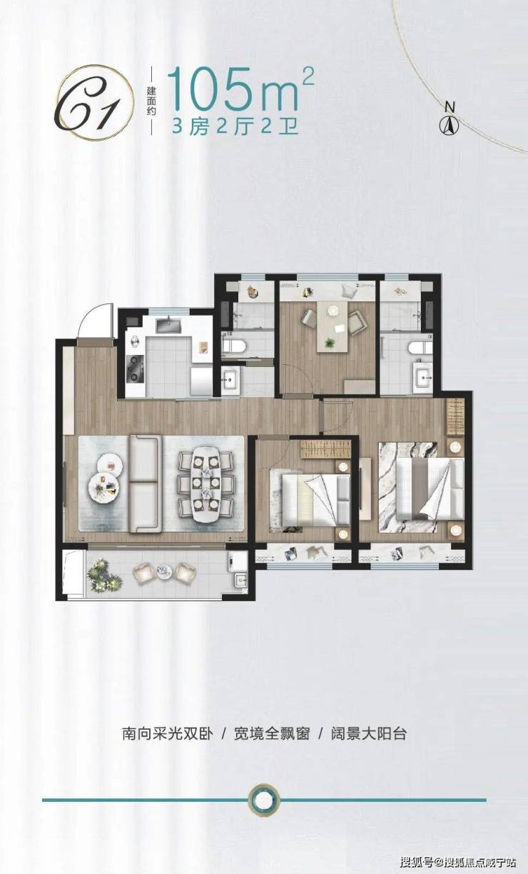 比如105㎡C2的竖厅户型,整体客厅的采光面达到了约3.6米,餐客厅横向尺寸高达约7.5米,加上270°全景景观,整体空间尺度感非常阔绰。