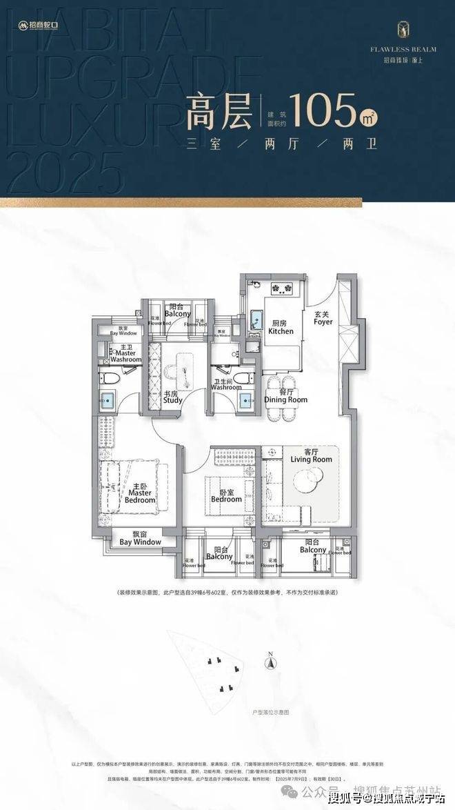 首先,是实用面积的跃升。建面约105㎡户型的三个阳台只算一半面积,花池不算面积,主卧自带非承重结构的飘窗,折算下来的空间是实打实的,远超市面上同面积段其他产品