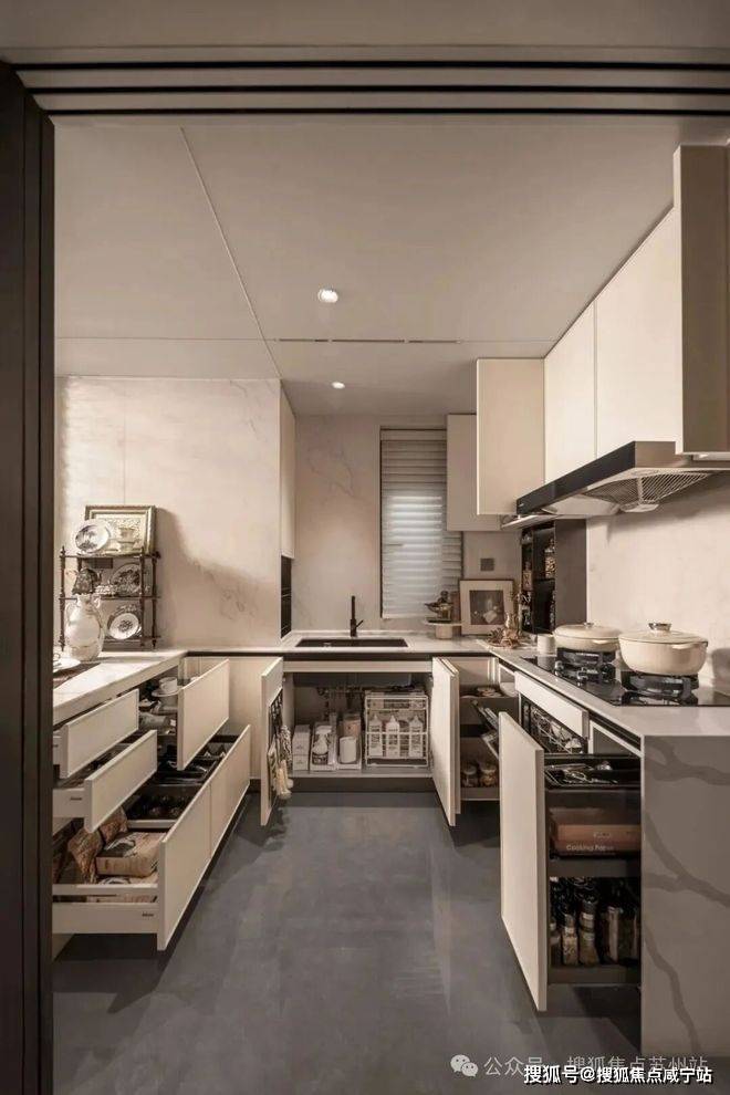厨房更是收纳主场,设置了多功能调味拉篮、定制谷物抽屉,让瓶罐各归其位,烹饪时少了琐碎,多了诗意。