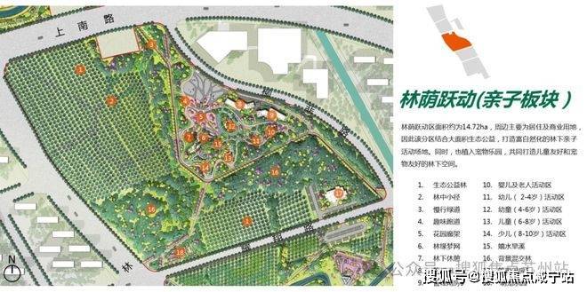 整座公园(在建中)划分为:湿地花园区、鸣湖共享区、林荫跃动区和社邻园艺区,四大功能分区。
