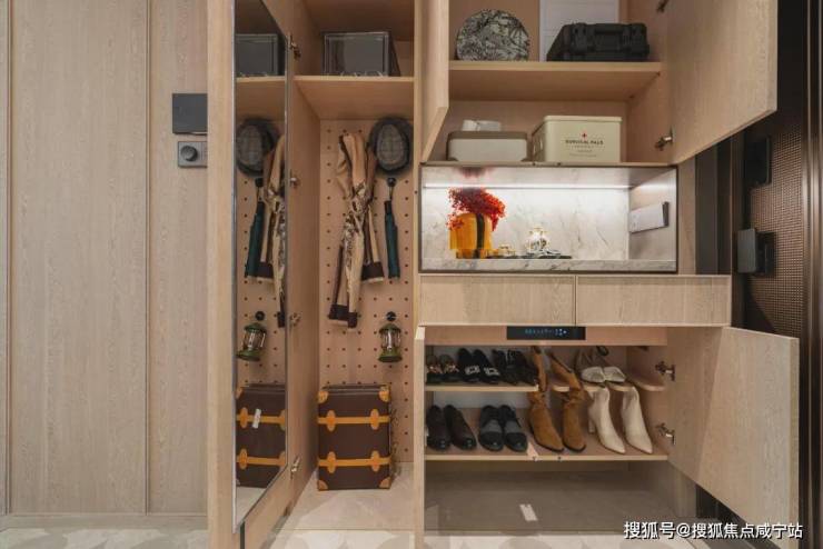 玄关收纳更精细,每个格子的规划都很贴近生活,随手物件,女主人的高靴,吸尘器等都有各自安置空间。