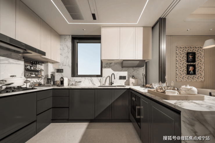 整体动静分区的格局下,U型厨房不只是烹饪场域,更因融入“社交属性”而成为家庭互动的温情角落,烹饪的同时可与客厅的家人交流。