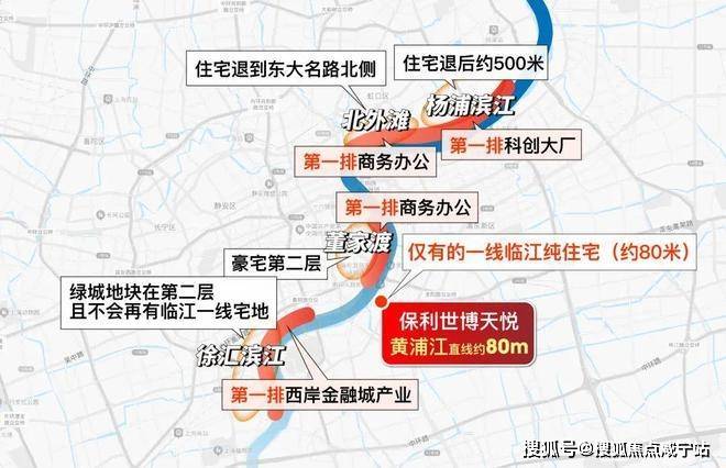 而在杨浦,临江第一排给到了科创大厂,住宅退到500米外。