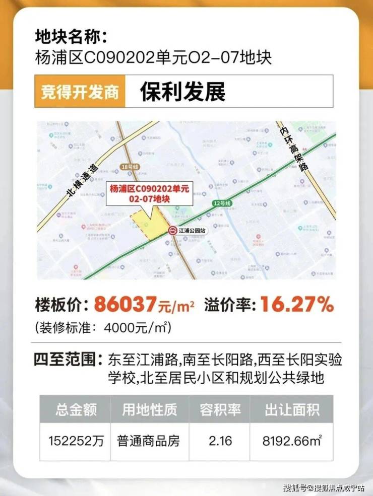 2024年11月28日,保利发展以152252万元竞得杨浦区C090202单元O2-07地块(江浦街道77街坊),溢价率16.27%,楼板价86037元/㎡。