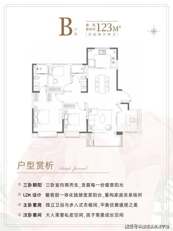 在当下100㎡及以下面积段占绝大多数的情况下,建面约123㎡4房本就十分稀缺。而在产品设计上更加符合全龄段各种家庭结构的居住需求。