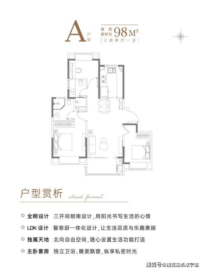 建面约98㎡3房:可以说这款户型满足了市场对刚需、刚改入门面积的所有需求,经典的三开间朝南飞机户型设计,最大化利用空间,减少面积浪费,整体格局方正南北通透。