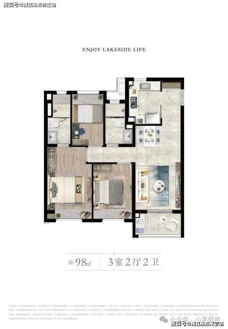 建面约98㎡3房2卫格局非常方正,每卧空间利用率高,三房都能做成卧室。南向三开间超大面宽,南北通透且全明采光,独立的餐厅空间满足家人用餐,客厅连接大阳台,室外美景一览无遗;玄关设计既保证了主人的私密性,又提升了尊贵感。