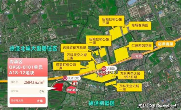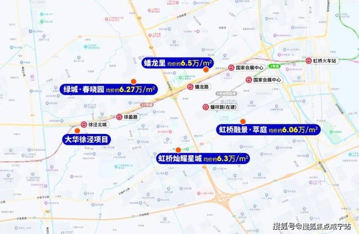 项目周边配套也是令人惊喜。交通上,项目北侧紧邻17号线徐泾北城站(需绕行河道),1站可达徐盈路天空万科广场,2站至蟠龙古镇商业区,3站直达国家会展中心,4站即达虹桥枢纽。