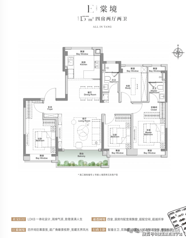 建面约105㎡3房2厅2卫,做到了三开间朝南+4个飘窗+双面阳台系统+主卧套房设计+270°转角飘窗,该户型的居住体验、舒适度、尺度感,是同级别产品所无法比拟的。