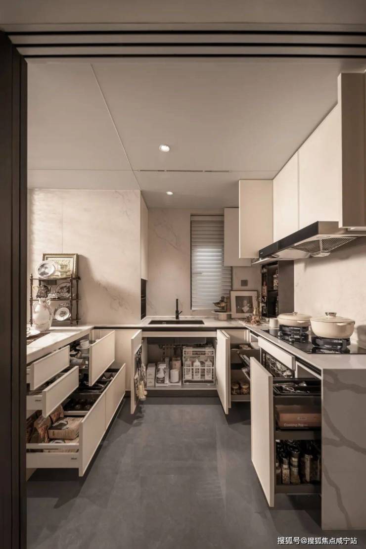 厨房更是收纳主场,设置了多功能调味拉篮、定制谷物抽屉,让瓶罐各归其位,烹饪时少了琐碎,多了诗意。