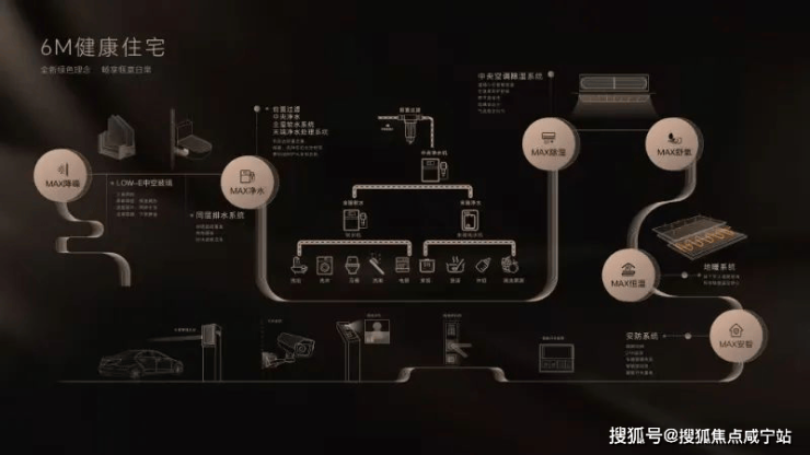 ⑤全屋配置6M健康智能住宅系统,这个智能系统系统涵盖降噪、净水、除湿、恒温、安智等多方面,呼应了好房子政策的全屋智能标准