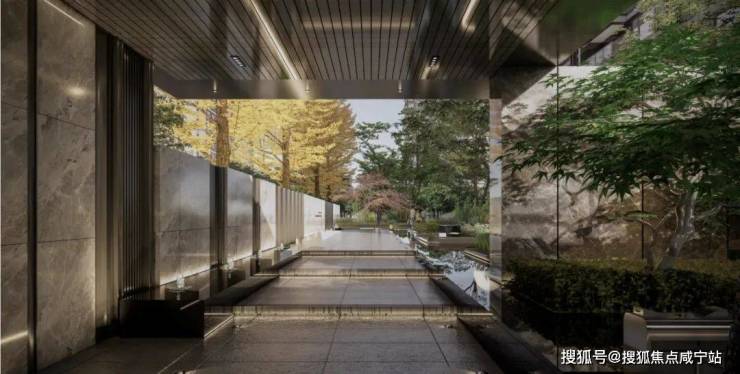 社区大门完全区分人行、车行入口,人行入口采用石材与玻璃搭配设计,大气恢弘!门厅景观水院精致高级,入户仪式感满满!