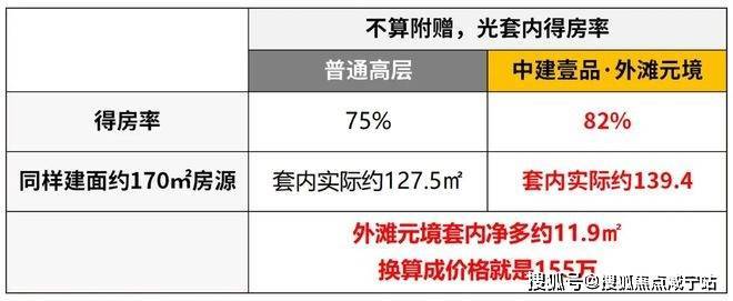 正常的新房,其套内的得房率最高也就是75%。而中建壹品·外滩元境的得房率足足有约82%。