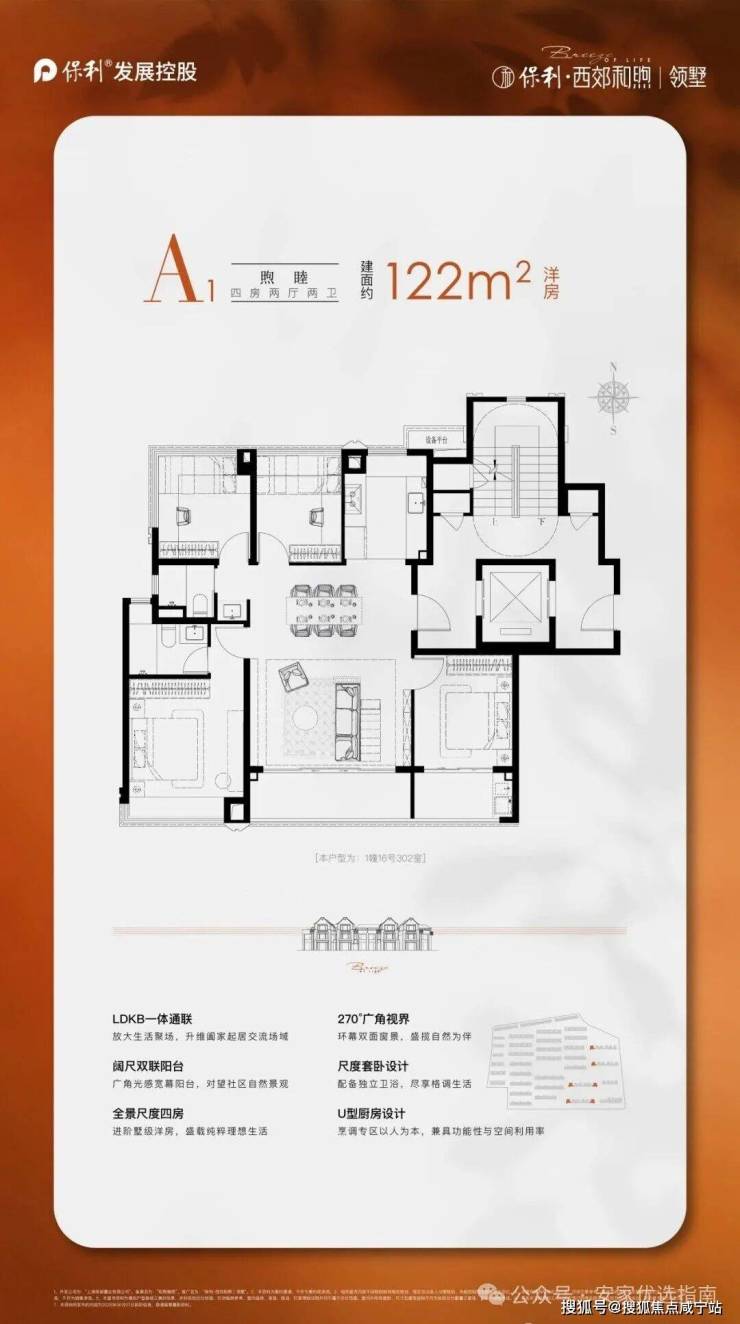 建面约139㎡精奢上叠,南向面宽同样达到了约9.2m、三开间朝南,首层全明设计,南北通透,面面瞰景,大尺度U型厨房,约2.2m的大岛台,搭配LDKB一体化动线,盛载亲情时光,温馨南向卧室搭配全景飘窗,满足家中长辈静心安居所需.