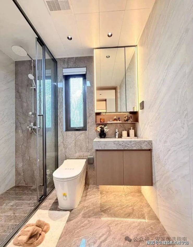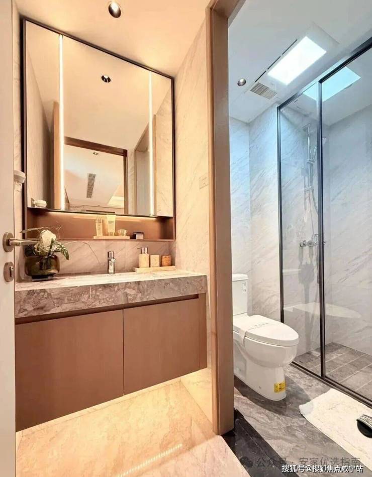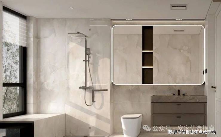配备美妆龙头,大容量镜柜可收纳洗漱用品,利用墙面空间设置壁龛,便于存放毛巾、衣物便于取用。