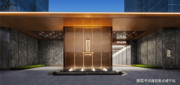 地上大堂,单元门厅的雨棚采用香槟金的弧面铝板、立面干挂爱马仕灰蜂窝岩板,岩板上嵌入专属楼栋号,单元门两侧的弧线段金属采用定制模具加工。