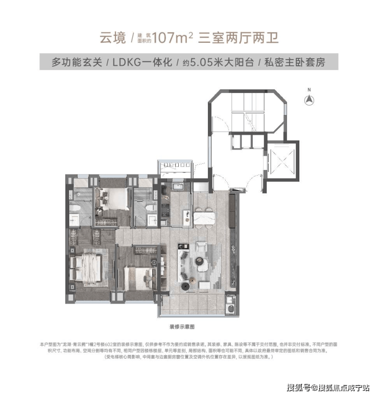 南向3.5个开间、约5.05米超宽横厅、瞰景双阳台,形成超大的采光面和观景视野,带来超乎想象的开阔感与震撼感。