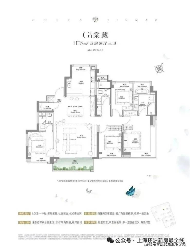 建面约117㎡3房2厅2卫,做到了3+1开间朝南+5个飘窗+主卧套房设计+270°转角飘窗,所有的尺度都有进一步提升。
