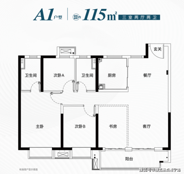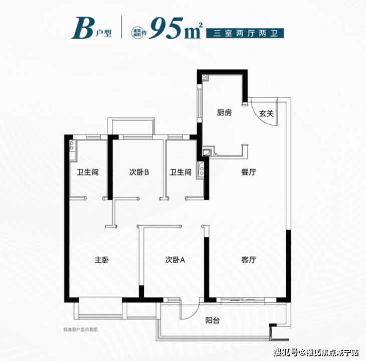 建筑面积约95㎡三房:双卫+南北通主卧,南向面宽近10米,预留岛台改造空间,可做到“二胎不换房”。