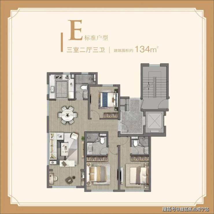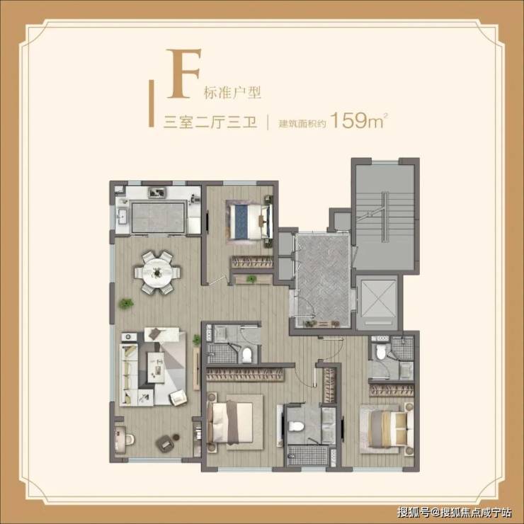 这个约159㎡户型称得上真正的公园住宅,客厅有多面采光窗,日照和公园视野出众,每一间房间都可以从不同角度看到公园景色;还有三卫配置,真正的卫生间自由,在绝对隐私保护。
