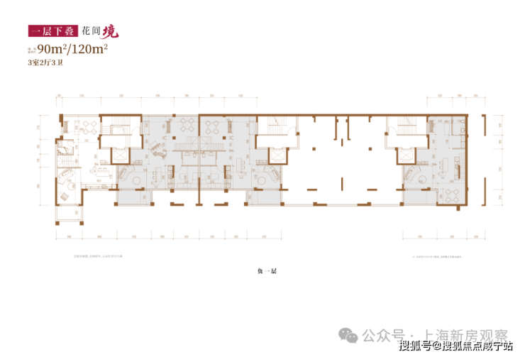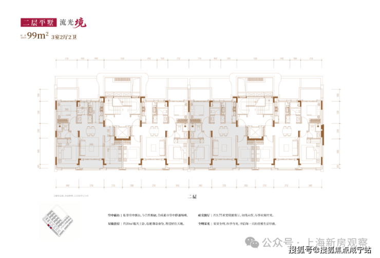 项目主打3层的超低密洋房产品,另有3套联排产品,户型类型丰富;洋房为创新的多层退台式洋房,层高高于传统常规洋房产品,3.3-3.6m层高对标别墅产品层高。