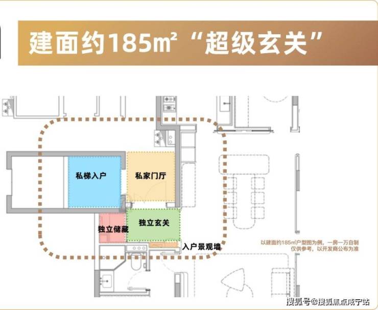 项目做到了独立私梯入户的归家效果,内外双玄关设计,还有一个独立的储物仓库