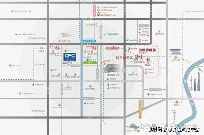 中建企业天地地处西虹桥核心商务区,与国家会展中心相邻,精准占据了虹桥新区的核心位置,位于虹桥核心区和商务扩展区之间,尽享得天独厚的地理优势。其周边交通设施极为完善,紧邻规划中的 2 号线潘祥路站,距离现有的 2 号线徐泾东站仅 600 米,步行即可实现快速换乘 10 号线和 13 号线(规划中)。此外,项目距离蟠龙路站约 500 米,未来 25 号线(规划中)还将连接至上海的核心区域,如静安寺、人民广场、陆家嘴和浦东机场等,畅达全城。不仅如此,项目距离虹桥高铁站约 3 公里,虹桥二号航站楼约 3.2 公里,无论是乘坐高铁奔赴国内各地,还是搭乘飞机前往世界各地,都十分便利。在高架道路方面,向北 740 米即是崧泽高架入口,连接嘉闵高架、北翟高架、延安路高架和北横通道等,形成四通八达的交通网络。同时,项目周边还有 G15、G50、G42、沪宁和沪杭等高速公路,方便快捷地连接全国各大核心城市,快速抵达长三角主要城市,为企业的商务出行与物流运输提供了坚实保障。