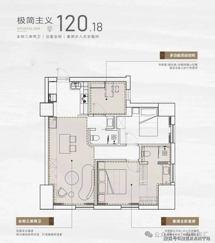 户型设计上,打破公寓常规暗间的局限,项目全部设计成全明2房或3房格局,做到没有一个暗间的居住空间,并全系标配主卧套房+双卫配置,提升居住配置。