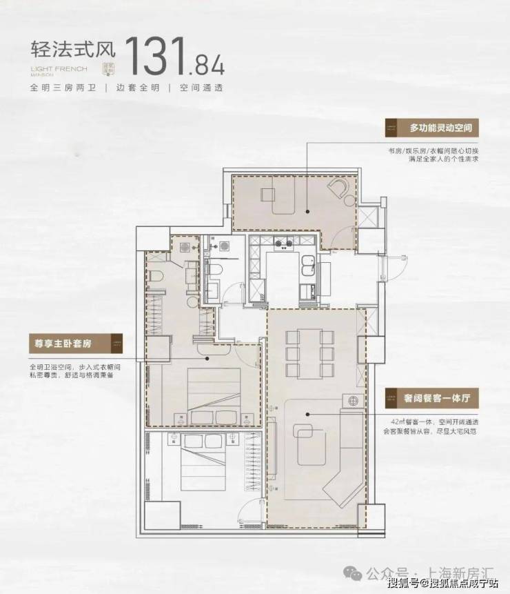 • 180㎡大平层:四开间朝南,270°转角阳台,主卧套房设计,配备独立衣帽间和卫生间,次卧和书房均带飘窗,空间尺度感极佳。