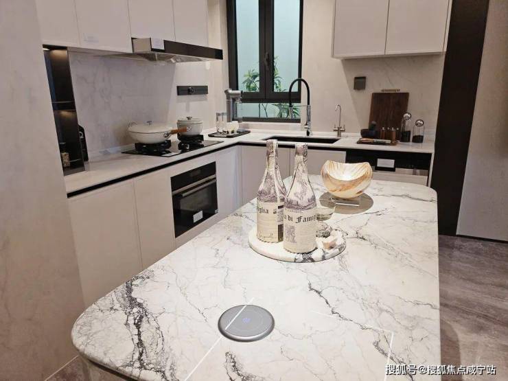 柜门白色烤漆面板,抽屉分区也都是帮大家细致划分,如多功能调味拉篮+谷物抽+碗碟拉篮等。岛台上配置可升降插座,铝合金抽屉,石材背景板的金属开放格实用性很强。