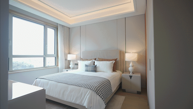 另外,一般项目为了凸显尺度感不会放床头柜,而在该户型,宝华不仅放了正常尺寸的大床,还配了两个大床头柜,主卧空间一目了然。